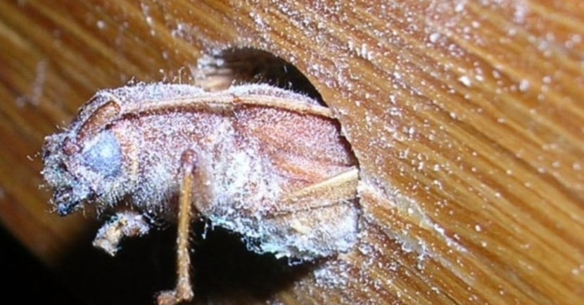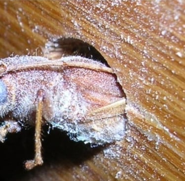 Una vez que notemos agujeros en la superficie de la madera, podremos entender que por ahí salió un escarabajo que deposito sus huevos, y esto puede llegar al punto de una plaga. Pero cómo sabemos que la prevención temprana es primordial; para saber si la plaga está activa o no es común ver alrededor de este agujero un polvillo fino, incluso parece talco, si se ve este polvillo en la superficie y además al golpear la madera sale polvillo y en el piso hay polvillo, la plaga está activa, pero si vemos las perforaciones en la superficie de la madera y no hay polvillo, entonces podemos concluir que hubo la existencia de la plaga, pero no está activa.